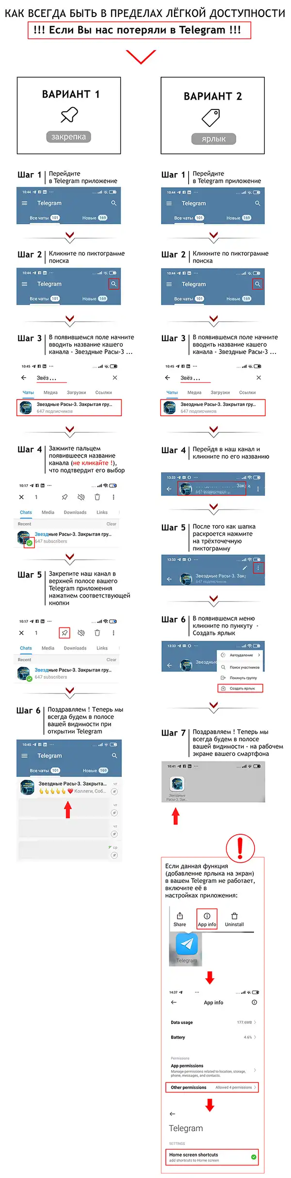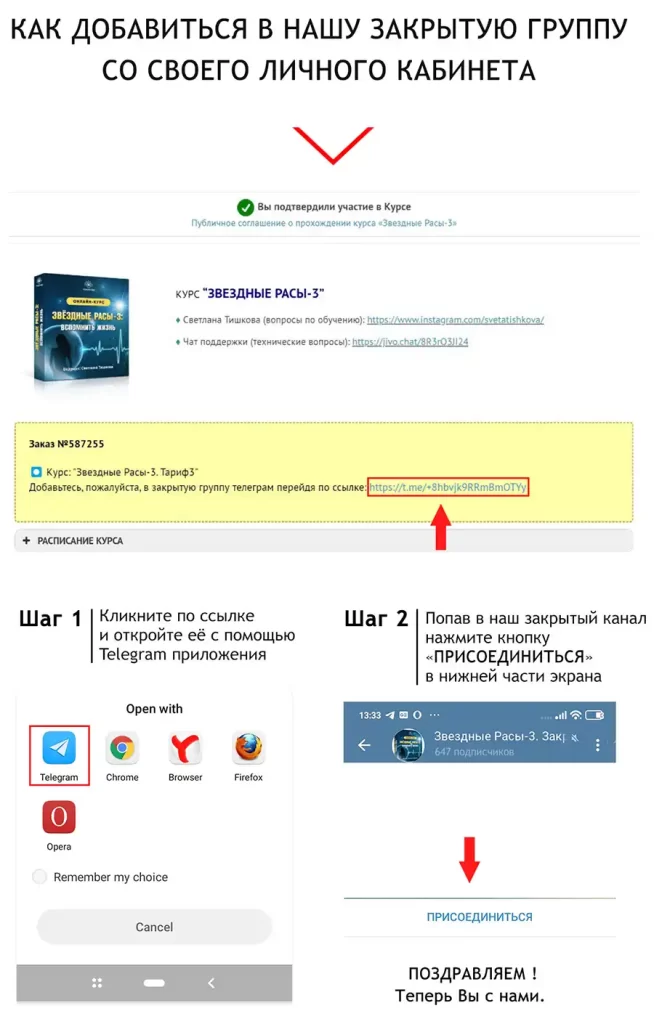 Перейдите в Telegram и выполните следующие шаги, как указано в инструкции (на примере Закрытой группы по Курсу “Звёздные расы-3”), по любому из предпочитаемых для вас вариантов.
