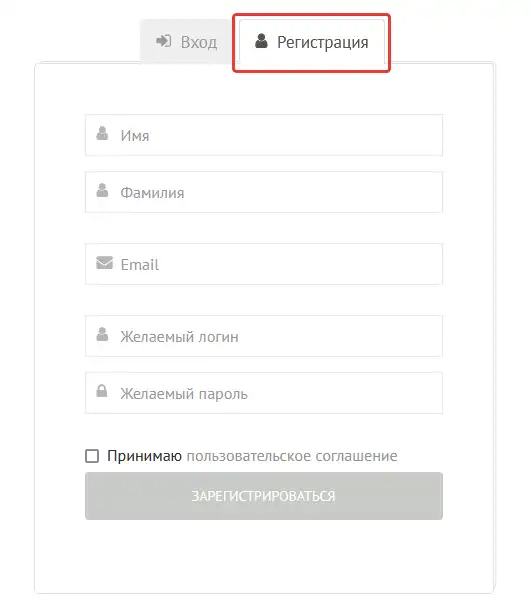 На открывшейся странице перейдите на вкладку формы Регистрации и зарегистрируйтесь.
