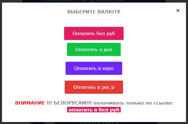 После нажатия кнопки ОПЛАТИТЬ, перед вами появиться модальное окно с возможностью выбора валюты платежа.
