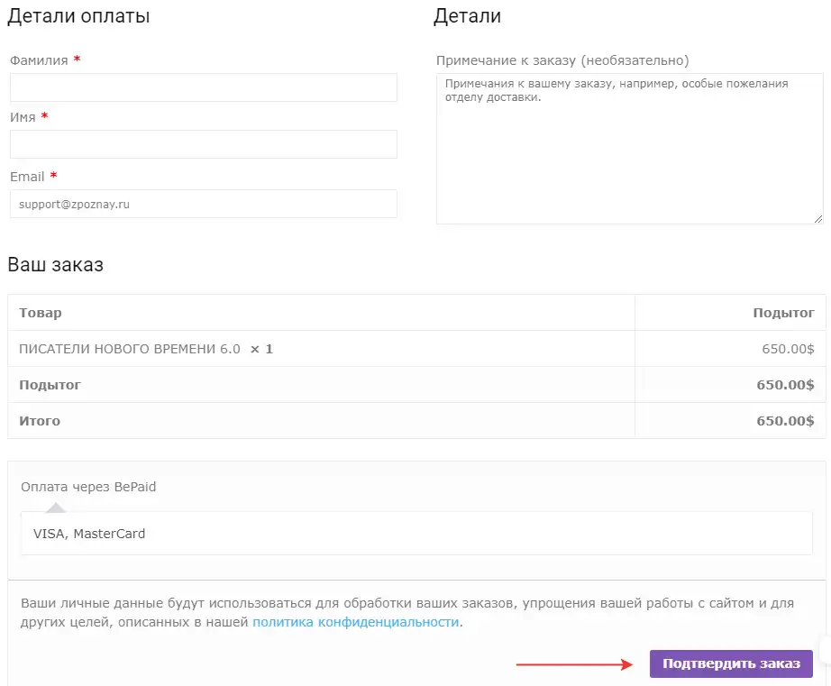 Заполните все обязательные поля формы заказа и нажмите кнопку Подтвердить заказ
